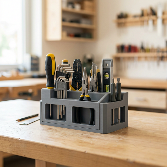 Цей тримач інструментів для DIY гаража надруковано під індивідуальне замовлення. Клієнт захотів позбутися безладу на столі, тому ми видрукували місткий органайзер з міцного CoPET пластику. Деталь надрукована у нашій майстерні 3D друку в Черкасах. Організація простору стає значно простішою, коли об'єкти мають своє визначене місце завдяки 3D друку технічних деталей. Технічна інформація